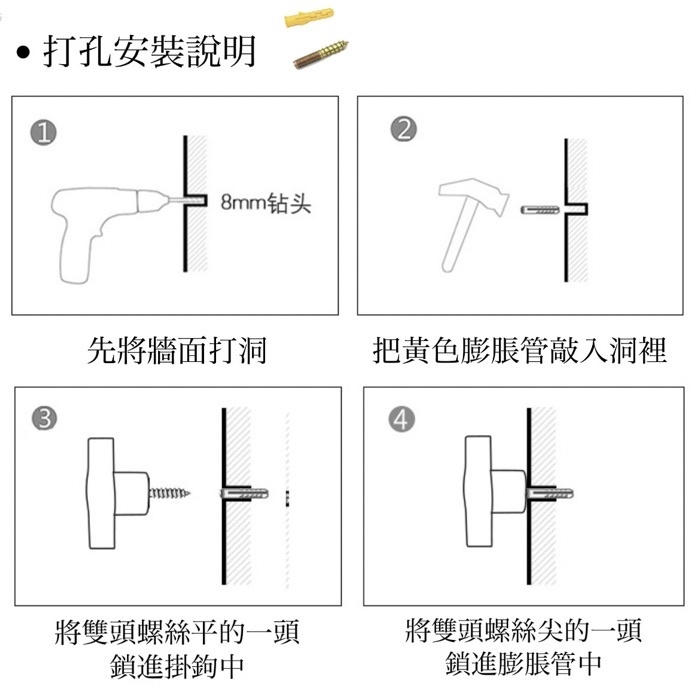 打孔:負重30kg,適用於粉刷漆面、壁紙牆壁