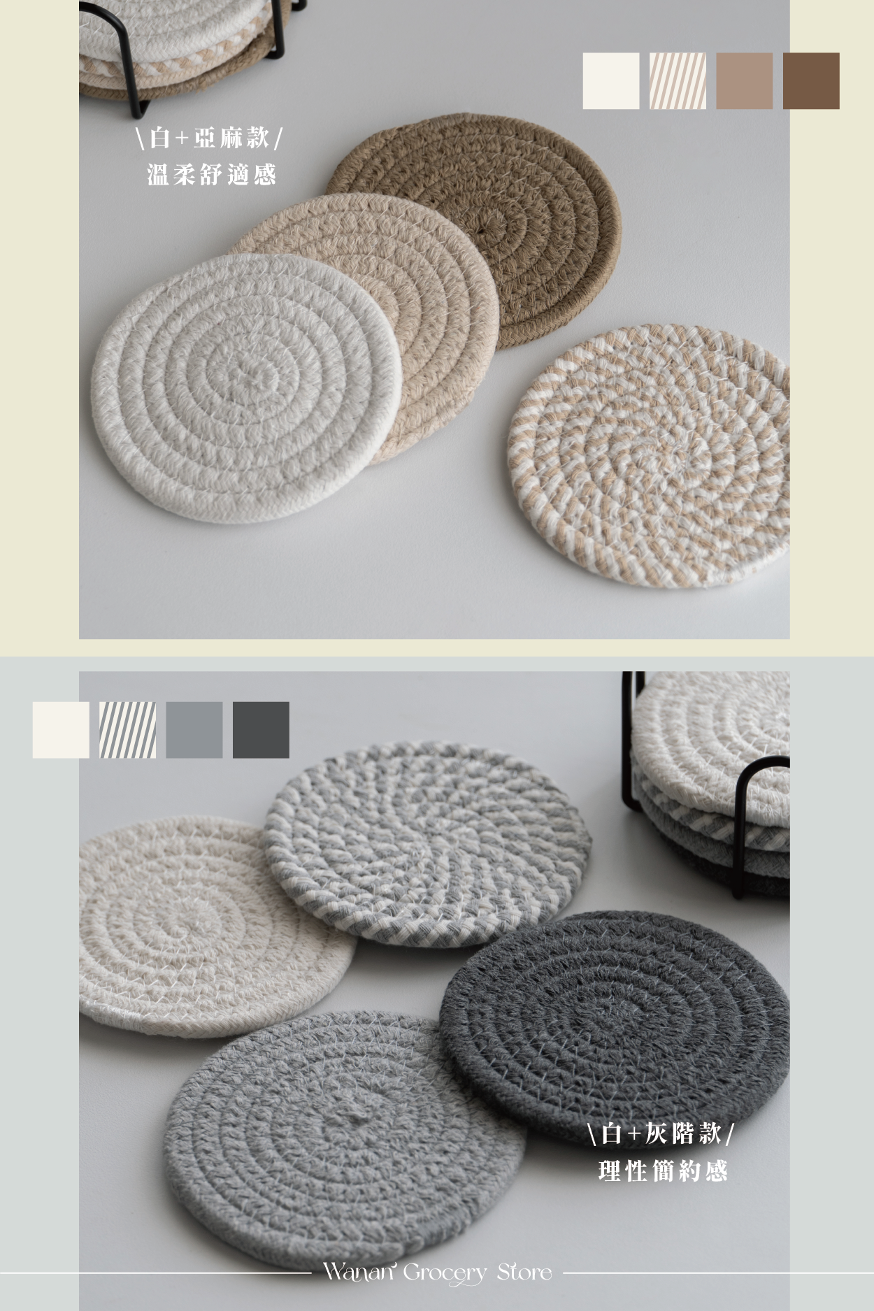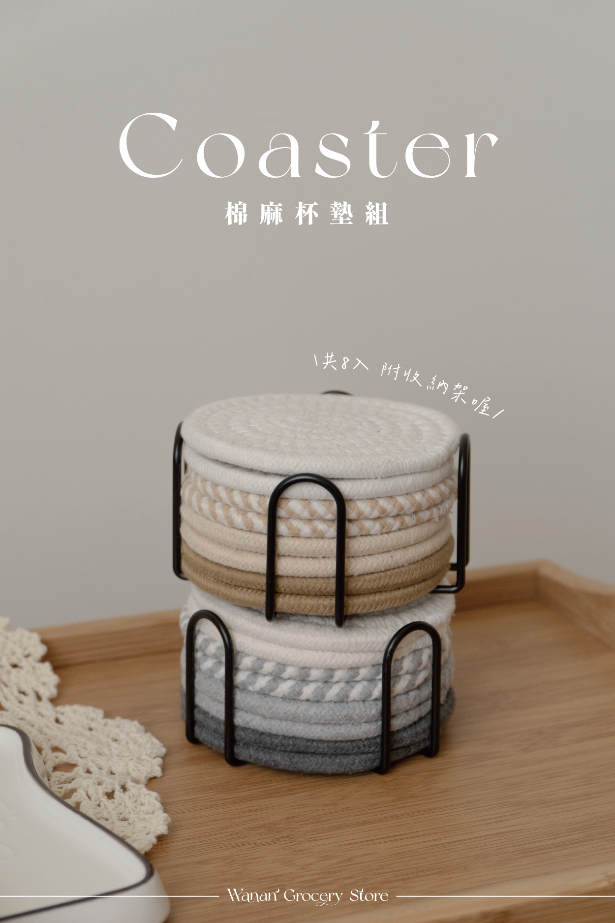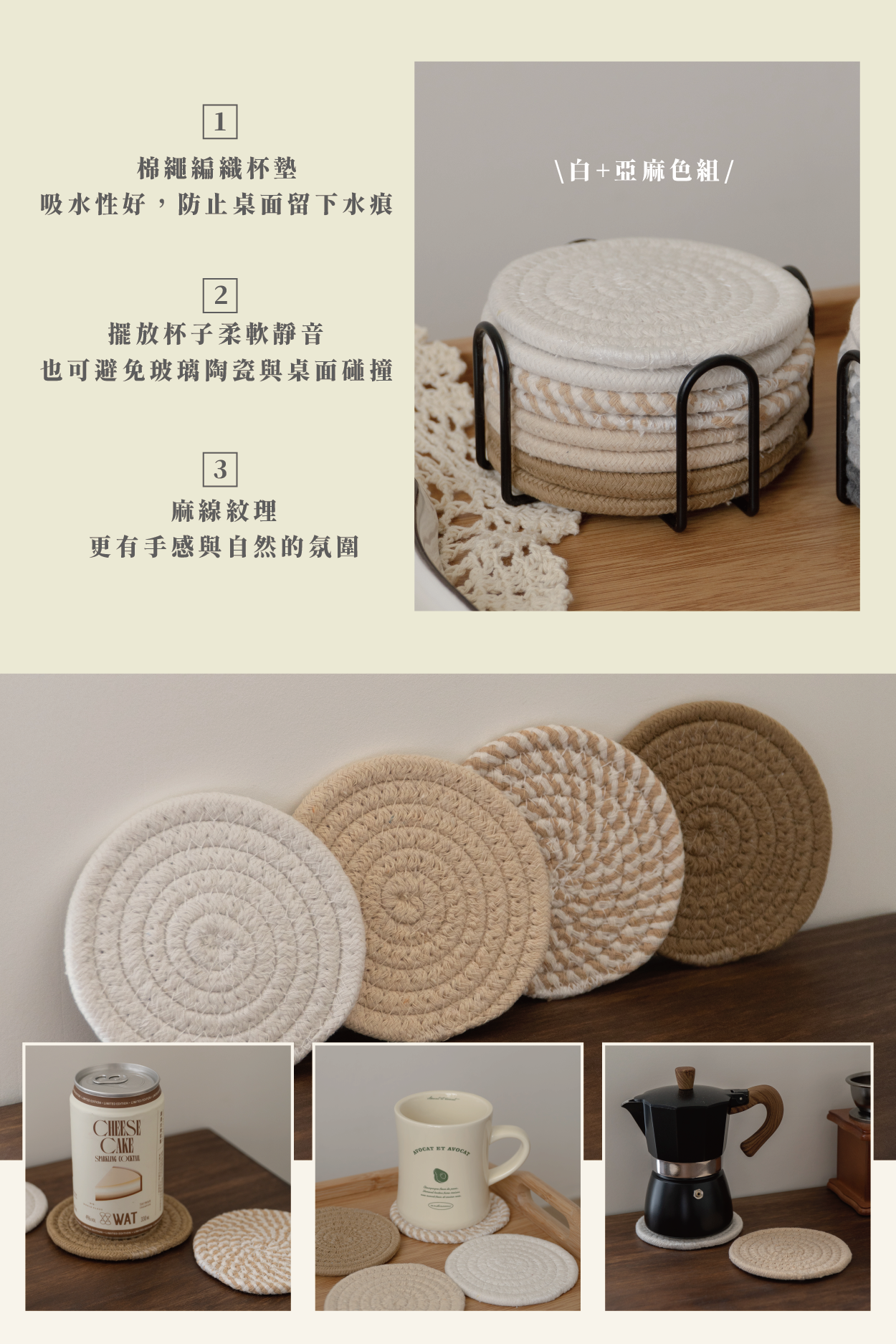 • 防止水痕:棉麻編織結構,快速吸附飲品底部水氣,保護桌面