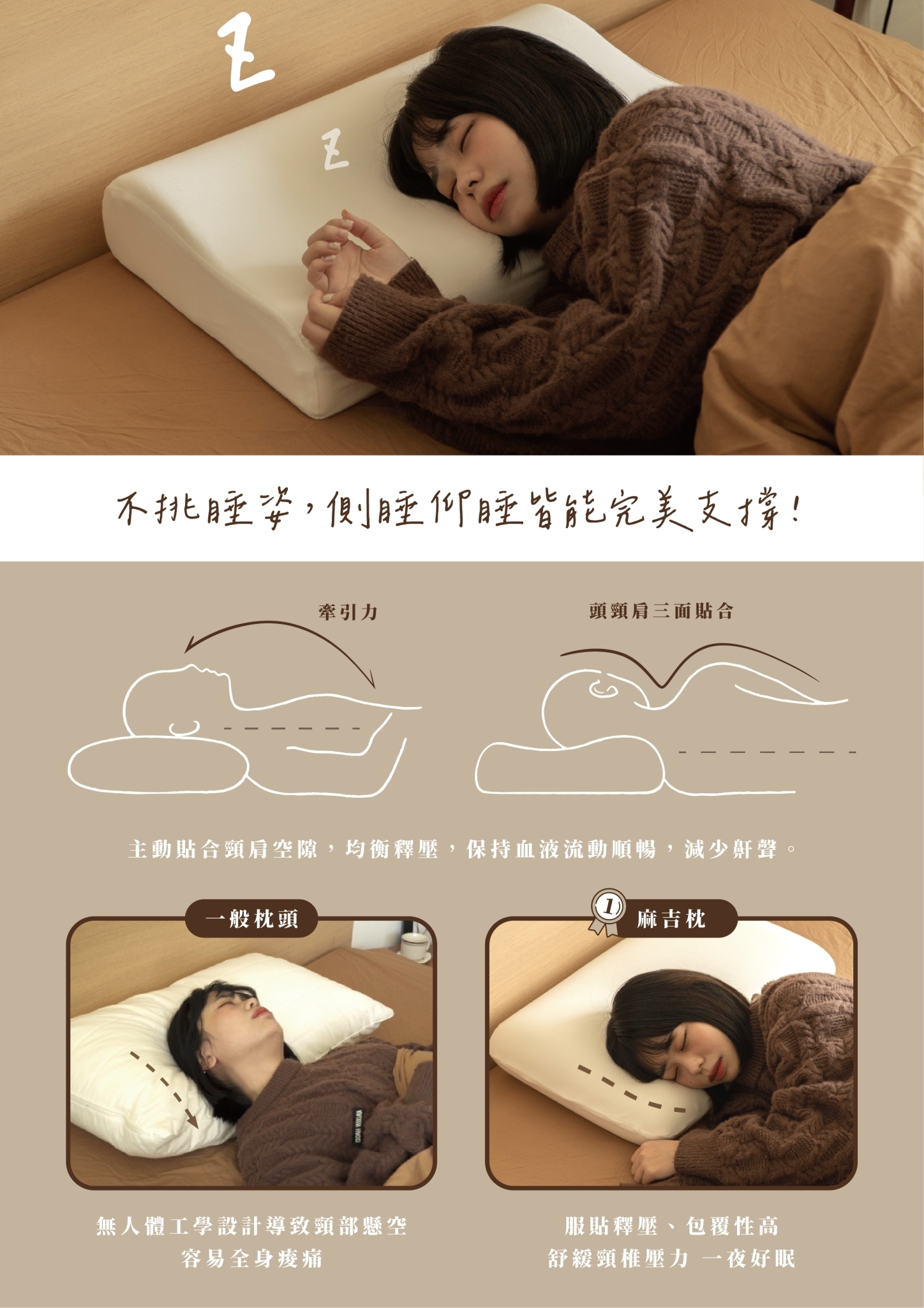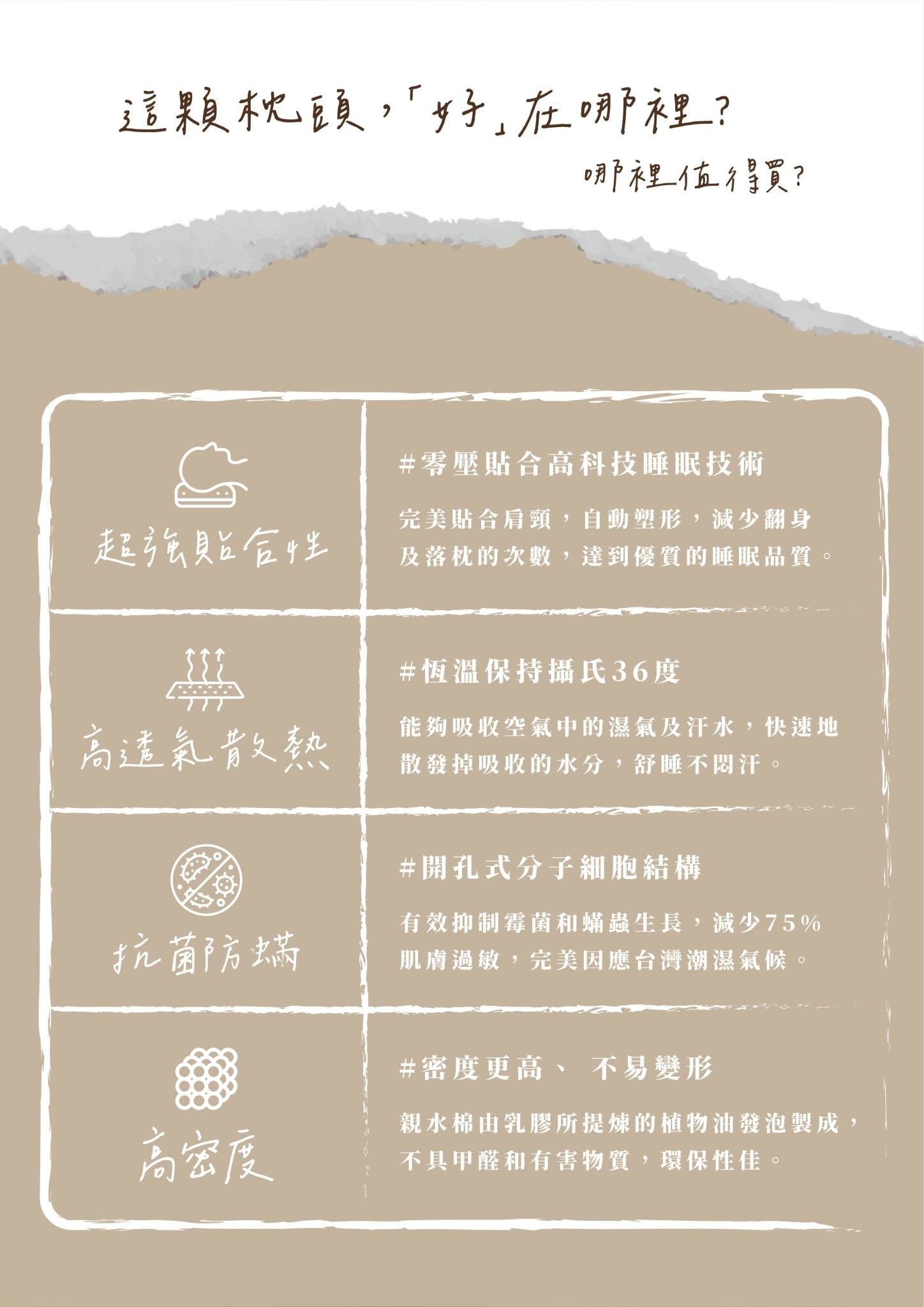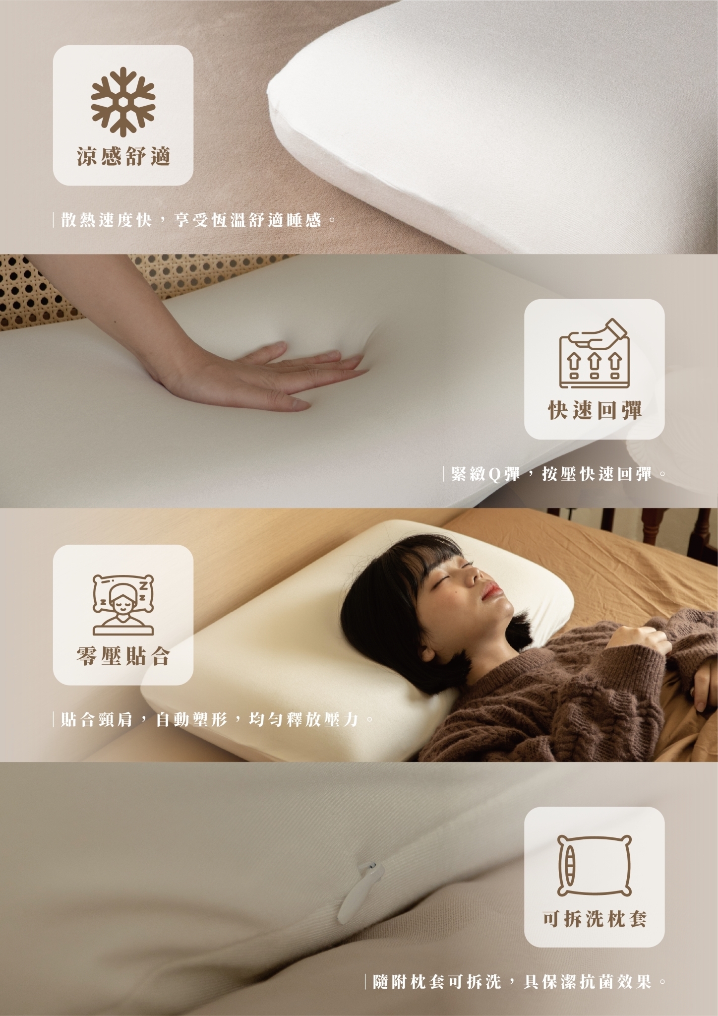 超強貼合性|塑造出完全符合人體的形狀,達到零壓狀態減少翻身及落枕的次數,達到優質的睡眠品質效果
