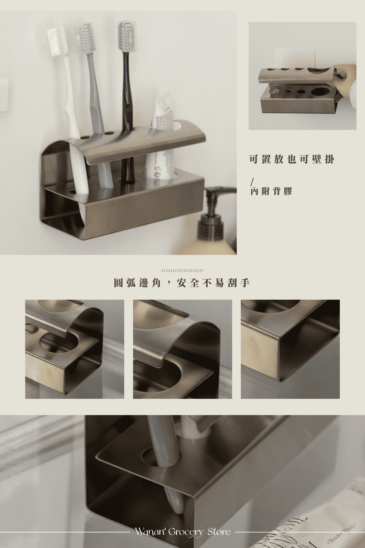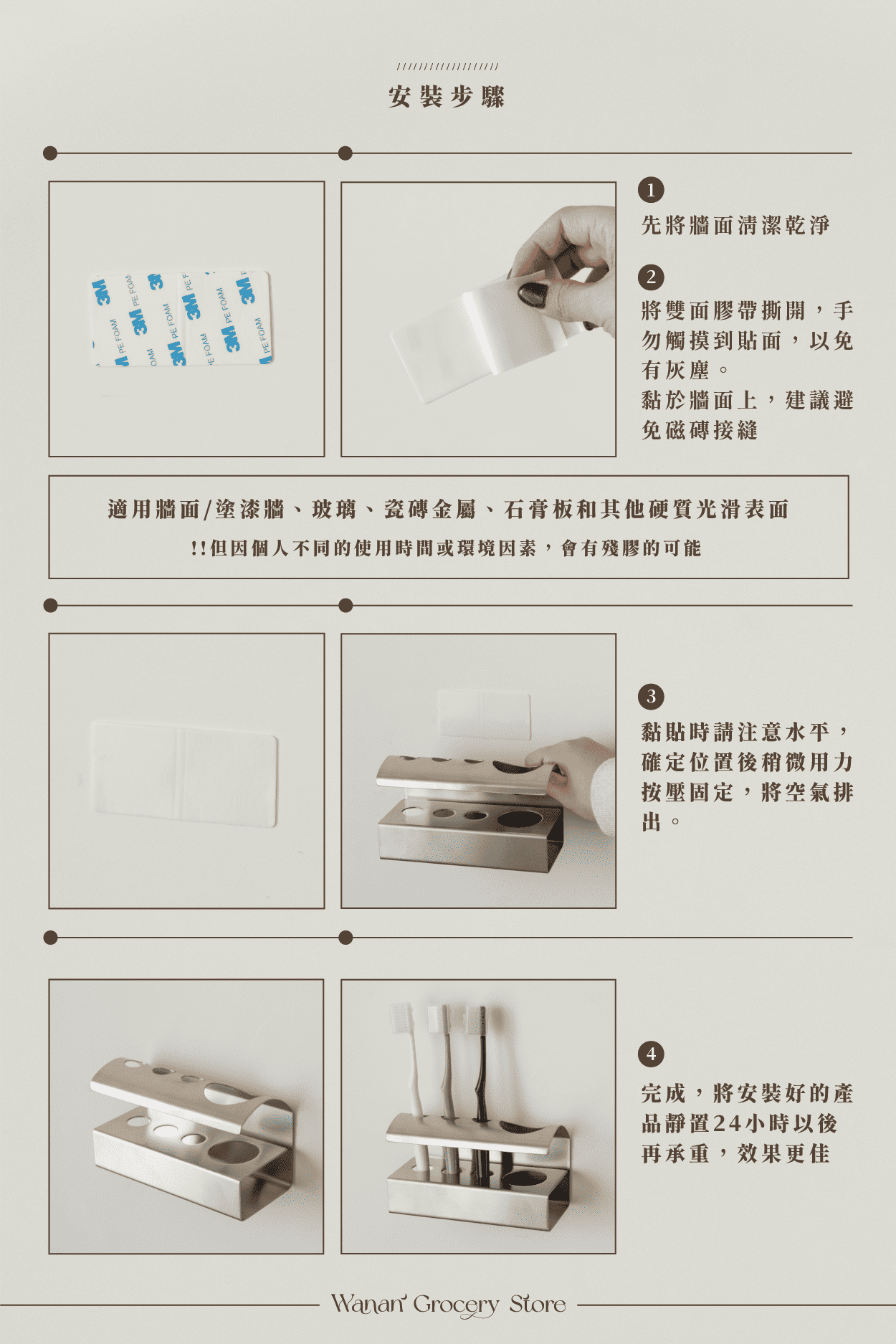 ⚠️背膠黏貼上去後,請先靜置24小時,再置放牙刷、物品等,要先讓他黏性加固!請務必貼在光滑牆面上!