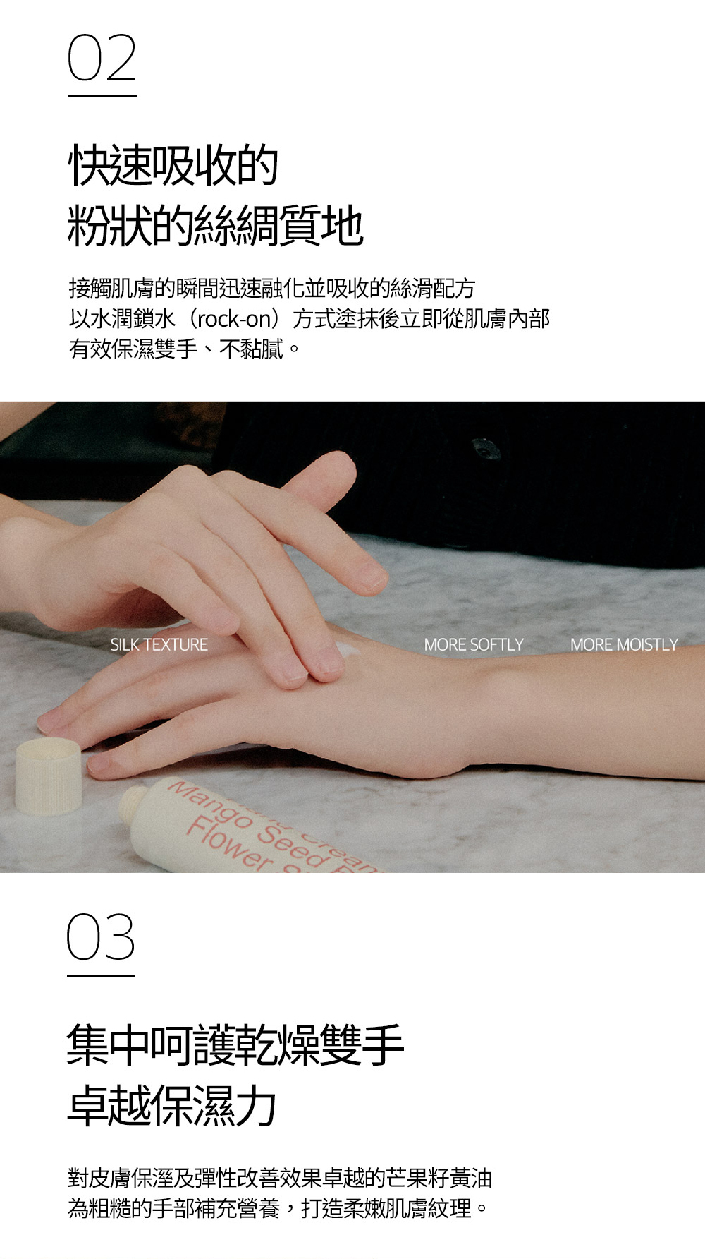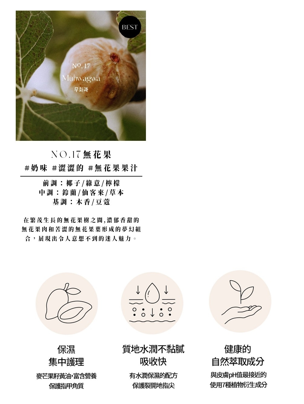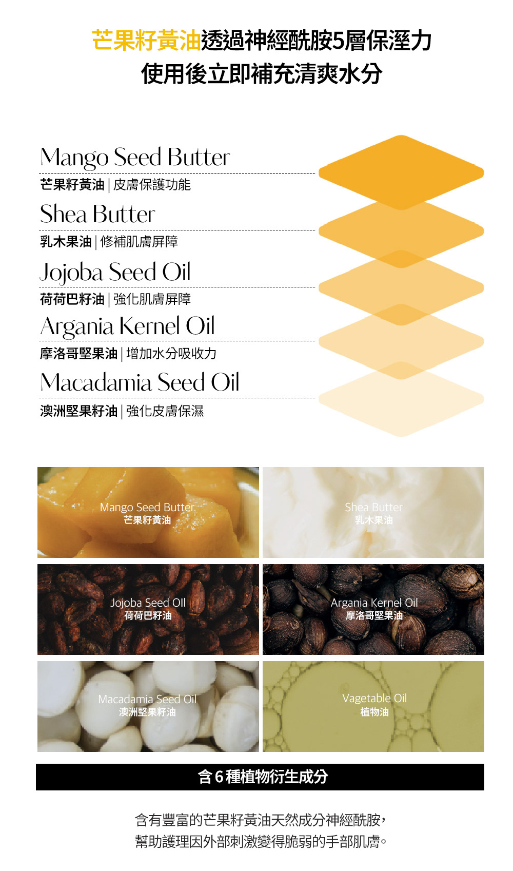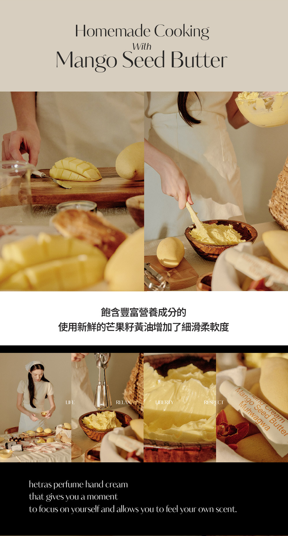 由韓國一級調香師調理的香氛加上芒果籽與黃油調和的保濕質地