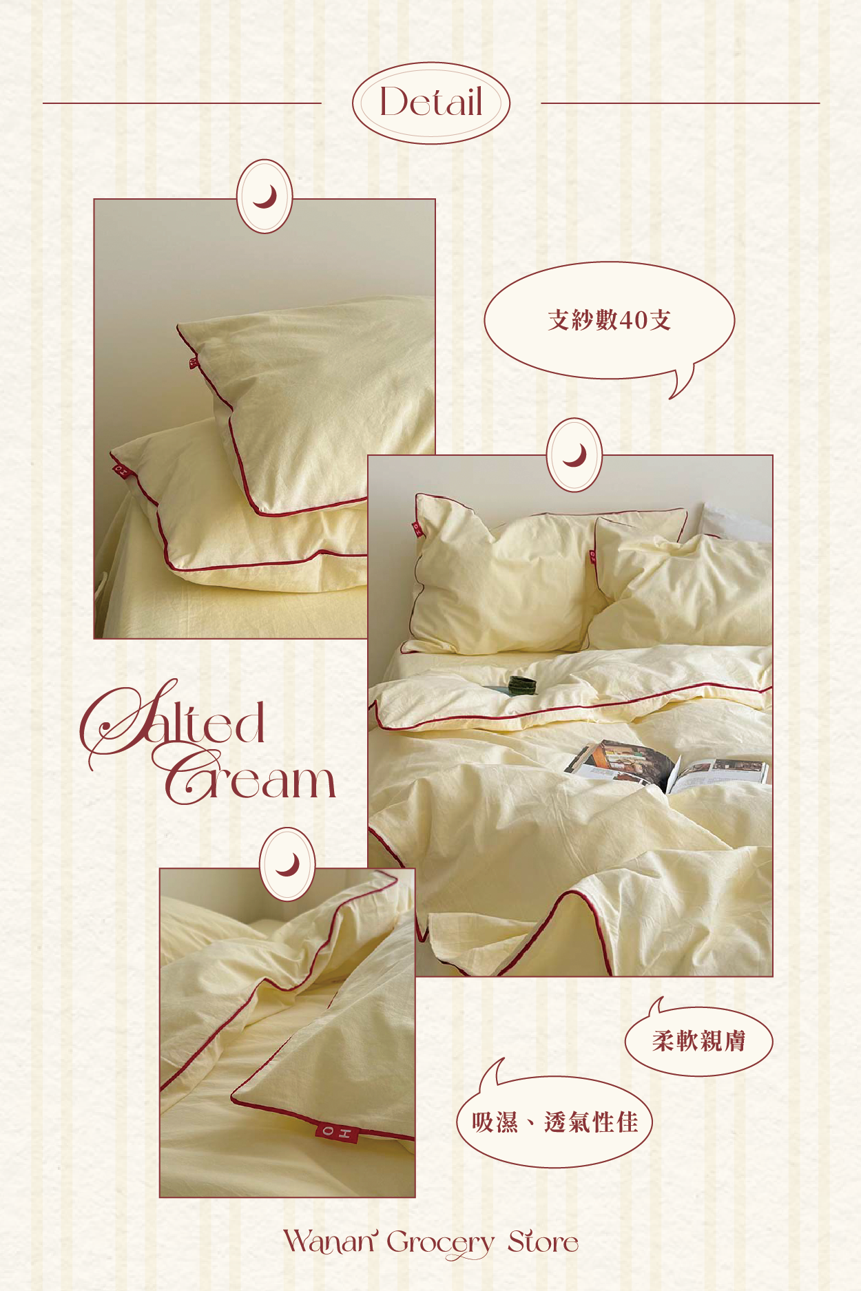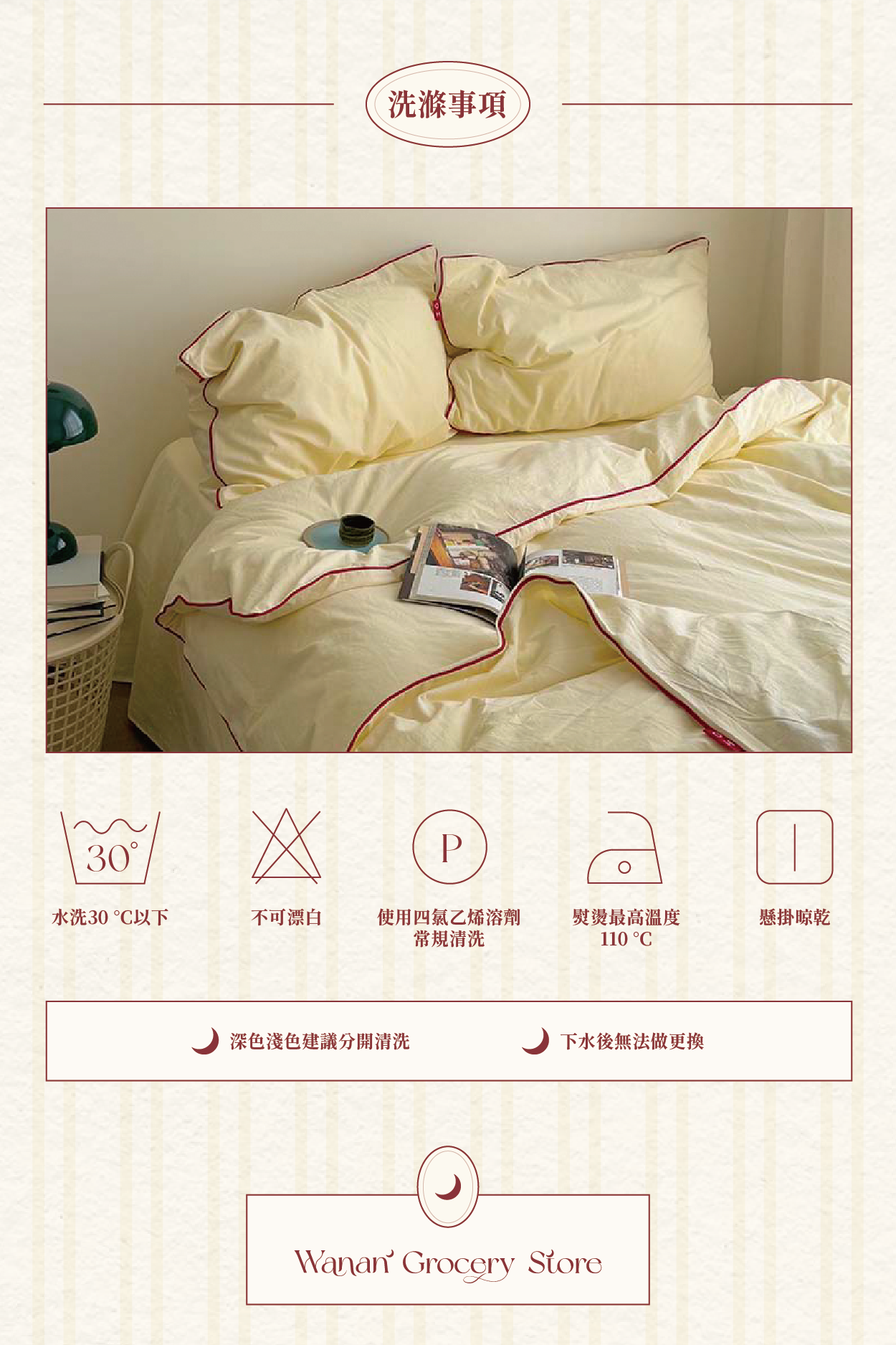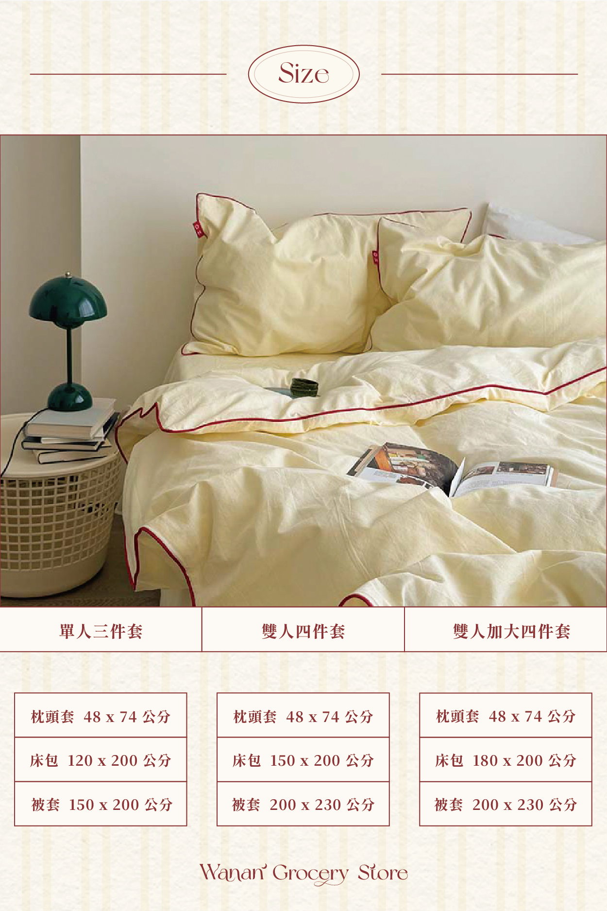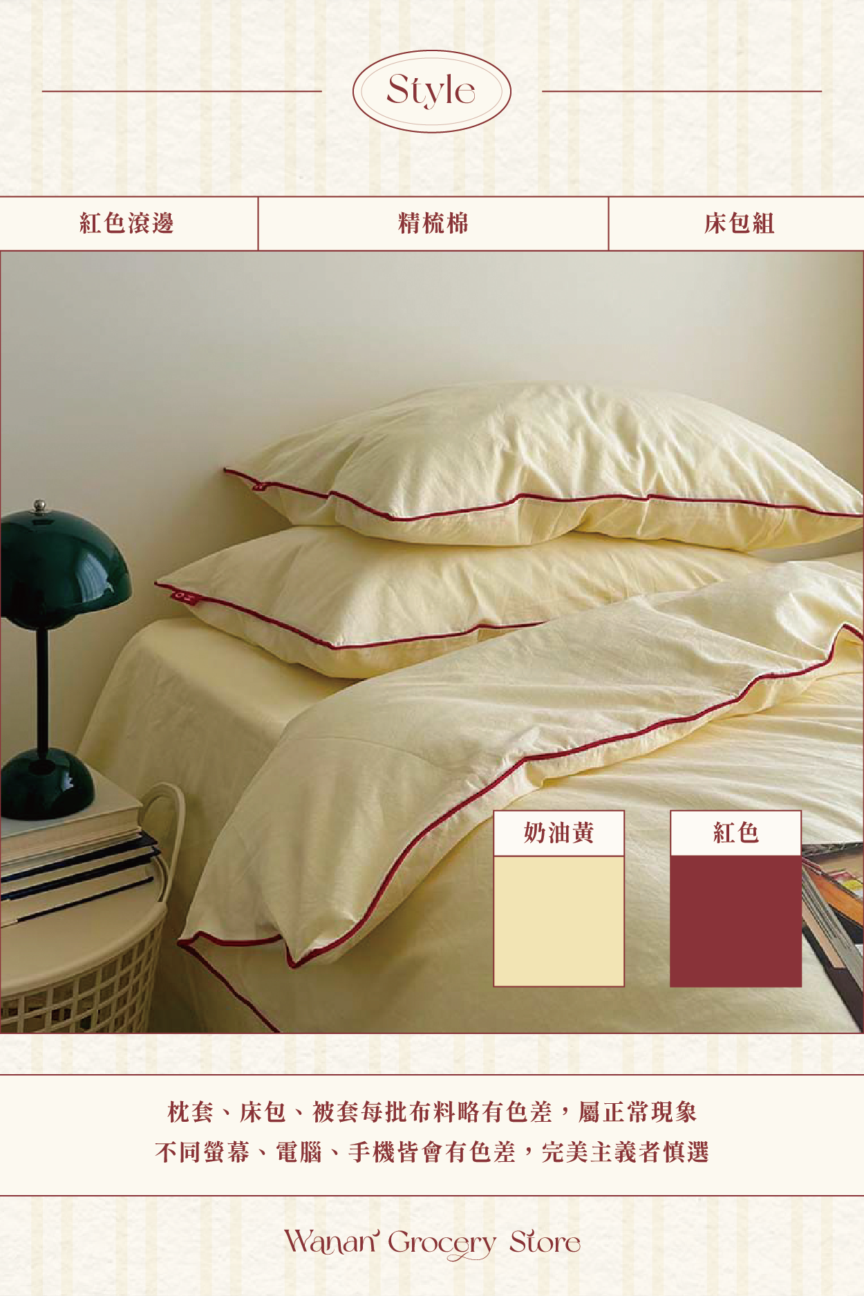 • 一組含滾邊被套+奶黃床包+滾邊奶黃枕頭套